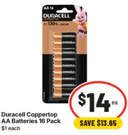 8Coles Duracell Coppertop Batteries AA 16 Pack or AAA 14 Pack offerDuracell Coppertop Batteries AA 16 Pack or AAA 14 PackColes$27.50$13.75$13.75 Discount11 February 202617 February 2026 View offer