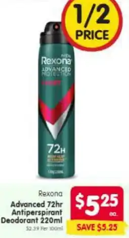 | Rexona Advanced Antiperspirant Aerosol Deodorant 220mL | Woolworths | $10.50 | $5.25 | $5.25 Discount | 21 January 2026 | 27 January 2026 | |