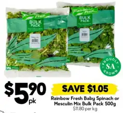 | Rainbow Fresh Baby Spinach or Mesculin Mix Bulk Pack 500 g | Drakes | $6.95 | $5.90 | $1.05 Discount | 22 April 2026 | 28 April 2026 | |