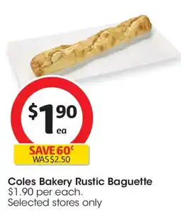 | Coles Bakery Rustic Baguette | Coles | $2.50 | $1.90 | $0.60 Discount | 04 February 2026 | 10 February 2026 | |