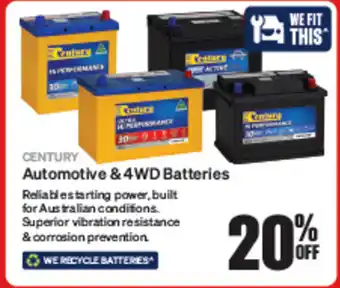 | 30% off* century automotive & 4wd batteries | SuperCheap Auto | 03 November 2022 | 13 November 2022 | ||||