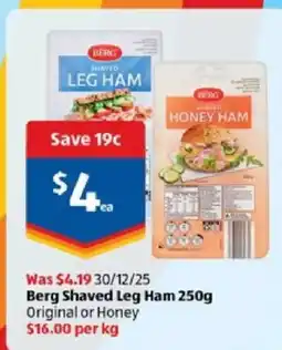 ALDI Berg shaved ham offerBerg shaved ham 250 gALDI$4.19$4.00$0.19 Discount04 February 202610 February 2026