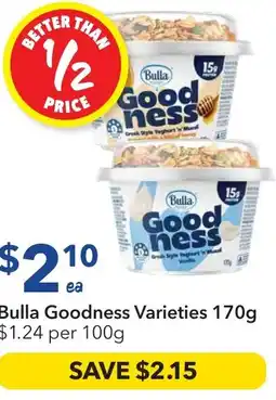 Farmer Jack's Bulla Goodness Greek Style Yoghurt 'n' Muesli offerBulla Goodness Greek Style Yoghurt 'n' Muesli 170 gFarmer Jack's$3.2511 February 202617 February 2026
