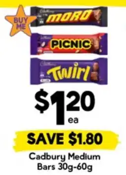 Drakes Cadbury Medium Bars offerCadbury Medium Bars 30 g-60 gDrakes$1.5012 November 202518 November 2025