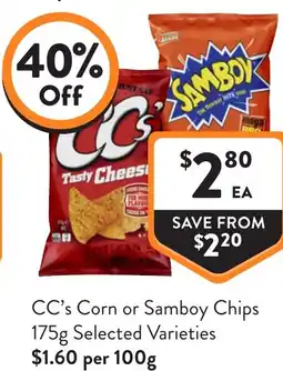 | Cc's corn or samboy chips 175 g | Foodworks | $2.50 | 31 December 2025 | 06 January 2026 | |||