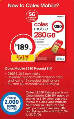 Coles Coles mobile prepaid sim offerColes mobile prepaid sim 210 gColes$240.00$189.00SAVE $5107 January 202613 January 2026
