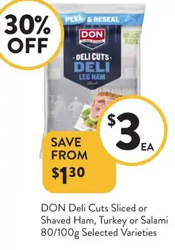 | Don Deli Cuts Sliced or Shaved Ham, Turkey or Salami 80/100 g | Foodworks | $3.00 | 30% OFF | 16 July 2025 | 22 July 2025 | ||