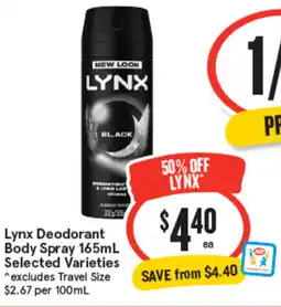 IGA Lynx Deodorant Body Spray or Antiperspirant 165mL Selected Varieties offerLynx Deodorant Body Spray or Antiperspirant 165mL Selected VarietiesIGA$8.00$4.00$4.00 Discount07 January 202613 January 2026