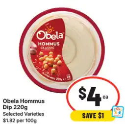 IGA Obela Hommus Dip 220g Selected Varieties offerObela Hommus Dip 220g Selected VarietiesIGA$5.00$4.00$1.00 Discount16 October 202422 October 2024