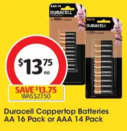 Coles Duracell Coppertop Batteries AA 16 Pack or AAA 14 Pack offerDuracell Coppertop Batteries AA 16 Pack or AAA 14 PackColes$27.50$13.75$13.75 Discount30 October 202405 November 2024