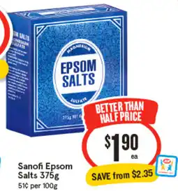 IGA Sanofi Epsom Salts 375g offerSanofi Epsom Salts 375gIGA$3.85$1.90$1.95 Discount19 November 202525 November 2025