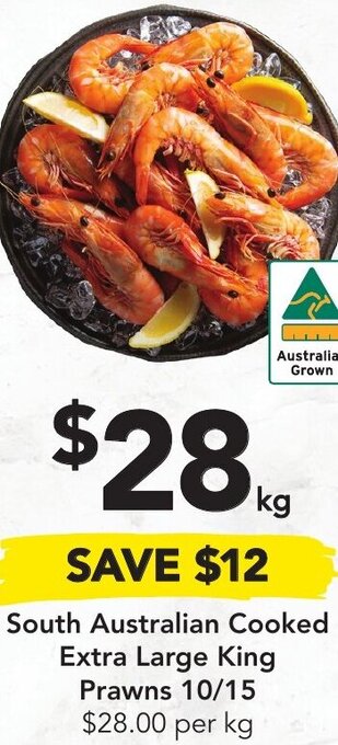 | South Australian Cooked Extra Large king Prawns 10/15 | Drakes | $28.00 | 07 September 2022 | 13 September 2022 | |||