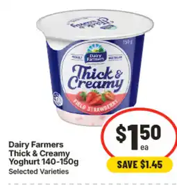 10IGA Dairy Farmers Thick & Creamy Yoghurt 140‑150g Selected Varieties offerDairy Farmers Thick & Creamy Yoghurt 140‑150g Selected Varieties 150gIGA$2.95$1.50$1.45 Discount25 February 202603 March 2026 View offer