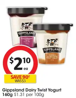 Woolworths Gippsland dairy twist yogurt offerGippsland dairy twist yogurt 700 gWoolworths$7.90$6.30$1.60 Discount04 February 202610 February 2026