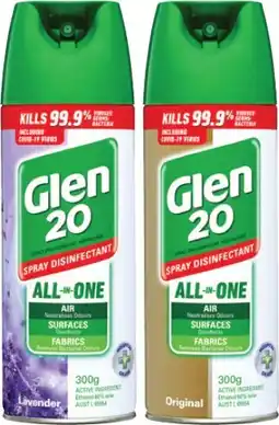 | Glen 20 Disinfectant Spray 300g Selected Varieties | IGA | $10.45 | $5.22 | $5.23 Discount | 28 August 2024 | 03 September 2024 | |