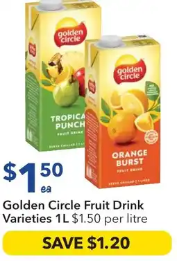 | Golden Circle Fruit Drink Varieties 1 l | Ritchies | $1.35 | 18 June 2025 | 24 June 2025 | |||