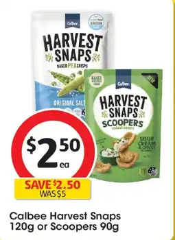 Coles Calbee Harvest Snaps Pea Crisps 120g or Scoopers 90g offer