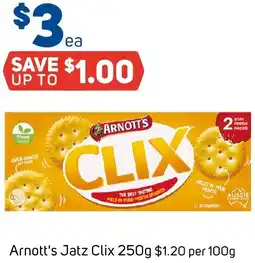 2Foodland Arnott's Jatz Clix offerArnott's Jatz Clix 250 gFoodland$4.00$3.00$1.00 Discount15 April 202621 April 2026 View offer