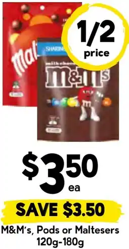 Coles M&m's, maltesers or pods offerM&m's, maltesers or pods 120 - 180 gColes$7.49$3.74$3.75 Discount18 February 202624 February 2026