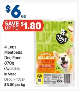 5Foodland 4 legs meatballs dog food offer4 legs meatballs dog food 870 gFoodland$7.80$6.00$1.80 Discount25 February 202603 March 2026 View offer