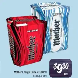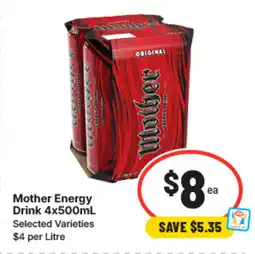 IGA Mother Energy Drink 4x500mL Selected Varieties offerMother Energy Drink 4x500mL Selected VarietiesIGA$13.35$9.30$4.05 Discount03 December 202509 December 2025