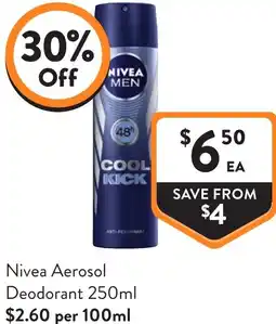 | Nivea Aerosol Deodorant 250 ml | Foodworks | $5.90 | 30% Off | 30 April 2025 | 06 May 2025 | ||