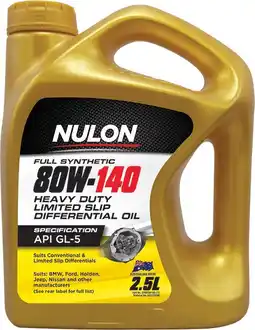 Autobarn Nulon Full Synthetic 80W-140 Heavy Duty Limited Slip Differential Oil offerNulon Full Synthetic 80W-140 Heavy Duty Limited Slip Differential Oil 2.5LAutobarn$69.99$49.99$20.00 Discount15 April 202605 May 2026