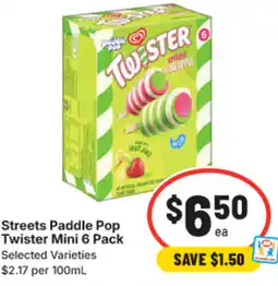 IGA Streets Paddle Pop Twister Mini Selected Varieties offerStreets Paddle Pop Twister Mini Selected Varieties 6 PackIGA$8.00$6.50$1.50 Discount11 February 202617 February 2026
