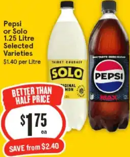 9Coles Pepsi or Solo Soft Drink 1.25 Litre offerPepsi or Solo Soft Drink 1.25 LitreColes$3.75$1.87$1.88 Discount15 April 202621 April 2026 View offer