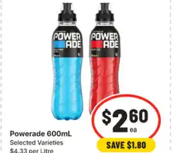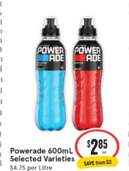 3IGA Powerade or Powerade Active Water 600mL Selected Varieties offerPowerade or Powerade Active Water 600mL Selected VarietiesIGA$4.40$2.60$1.80 Discount14 January 202620 January 2026 View offer