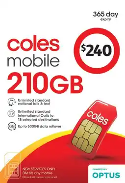1Coles Coles Mobile $240 Prepaid SIM offerColes Mobile $240 Prepaid SIMColes$240.00$189.00$51.00 Discount04 February 202610 February 2026 View offer
