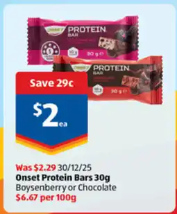 1ALDI Onset protein bars offerOnset protein bars 30 gALDI$2.29$2.00$0.29 Discount04 February 202610 February 2026 View offer