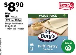Woolworths Borg's Traditional Puff Pastry 1.9 kg Pk 12 – From the Freezer offerBorg's Traditional Puff Pastry 1.9 kg Pk 12 – From the FreezerWoolworths$9.00$8.90$0.10 Discount22 October 202528 October 2025