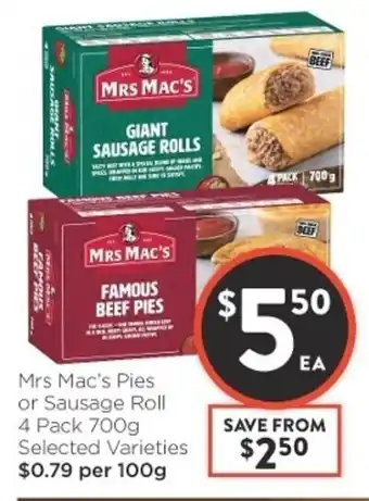 | Mrs Mac's Beef Pie or Giant Sausage Roll 4 Pack 700/760g | Foodworks | $7.50 | 04 September 2024 | 10 September 2024 | |||
