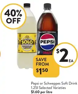 | Pepsi or schweppes soft drink 1.25 l | Foodworks | $3.00 | 2 for | 30 July 2025 | 05 August 2025 | ||