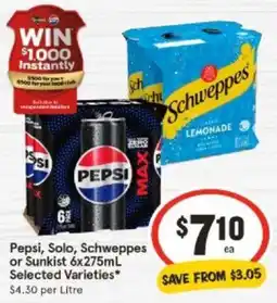 | Pepsi, Solo, Sunkist. Schweppes 6x275mL or Schweppes Mixers 6x200mL Selected Varieties | IGA | $9.00 | $5.40 | $3.60 Discount | 10 April 2024 | 16 April 2024 | |