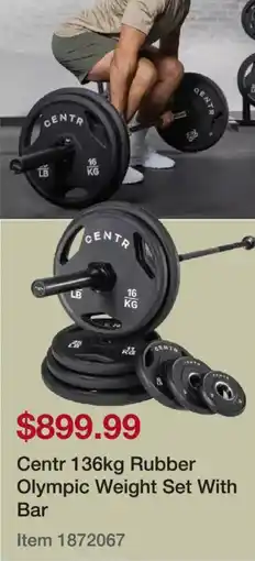 | Centr Rubber Olympic Weight Set With bar 136kg | Costco | $899.99 | 19 January 2026 | 15 February 2026 | |||