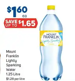 | Mount Franklin Lightly Sparkling 1.25 Litre | Foodland | $1.85 | 07 February 2024 | 13 February 2024 | |||