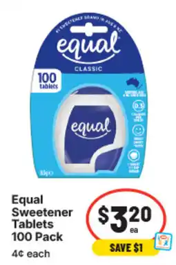 IGA Equal Sweetener Tablets 100 Pack offerEqual Sweetener Tablets 100 PackIGA$4.20$3.20$1.00 Discount10 September 202516 September 2025