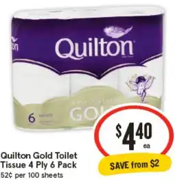 10IGA Quilton Gold Toilet Tissue 4 Ply offerQuilton Gold Toilet Tissue 4 Ply 6 PackIGA$6.40$4.40$2.00 Discount15 April 202621 April 2026 View offer