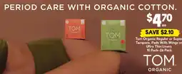 Tom Organic Regular or Super Tampons, Pads With Wings or Ultra Thin Liners
