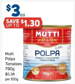| Mutti Polpa Finely Chopped Tomatoes 400g | Foodland | $1.70 | 01 November 2023 | 07 November 2023 | |||