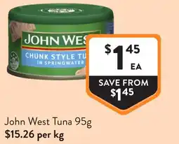| John West Tuna 95g | Foodworks | $1.15 | 28 July 2021 | 03 August 2021 | |||