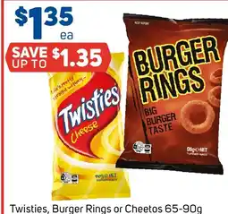 Spar Burger rings, twisties or cheetos offerBurger rings, twisties or cheetos 80 - 90 gmSpar$2.75$1.35$1.40 Discount21 January 202627 January 2026