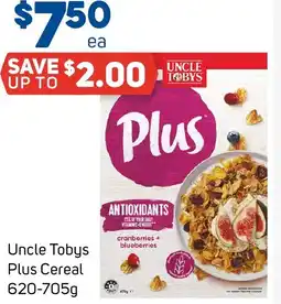 5Foodworks Uncle Tobys Plus Cereal offerUncle Tobys Plus Cereal 620-705 gFoodworks$8.80$7.50$1.30 Discount15 April 202621 April 2026 View offer