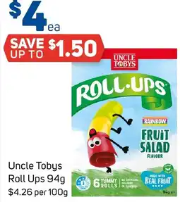 6Woolworths Uncle Tobys Roll Ups offerUncle Tobys Roll Ups 94g Pk 6Woolworths$5.50$2.75$2.75 Discount15 April 202621 April 2026 View offer