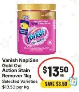 | Vanish NapiSan Gold Oxi Action Stain Remover Selected Varieties 1kg | IGA | $17.00 | $13.50 | $3.50 Discount | 17 December 2025 | 14 December 2025 | |