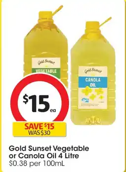 Coles Gold Sunset Vegetable or Canola Oil 4 Litre offerGold Sunset Vegetable or Canola Oil 4 LitreColes$30.00$15.00$15.00 Discount21 January 202627 January 2026