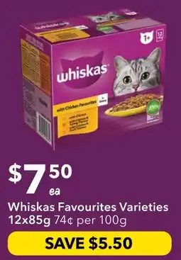 Supa Valu Whiskas favourites wet cat food offerWhiskas favourites wet cat food 85 gSupa Valu$13.00$7.50$5.50 Discount25 February 202603 March 2026
