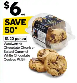 Woolworths Woolworths Chocolate Chunk or Salted Caramel White Chocolate Cookie Pk 5 offerWoolworths Chocolate Chunk or Salted Caramel White Chocolate Cookie Pk 5Woolworths$6.50$6.00$0.50 Discount19 November 202525 November 2025